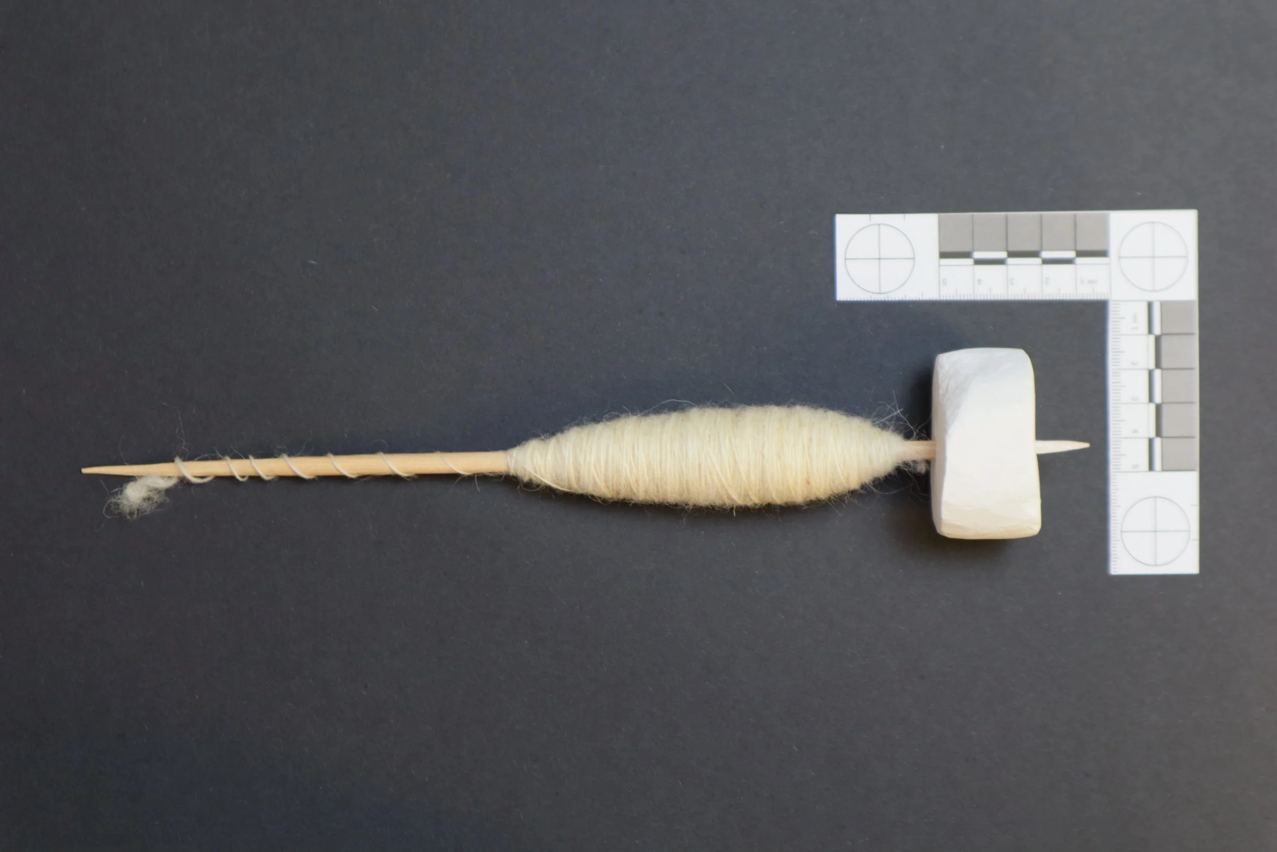 Bergschaf wool and chalk whorl carved to resemble an example from Danebury hillfort.