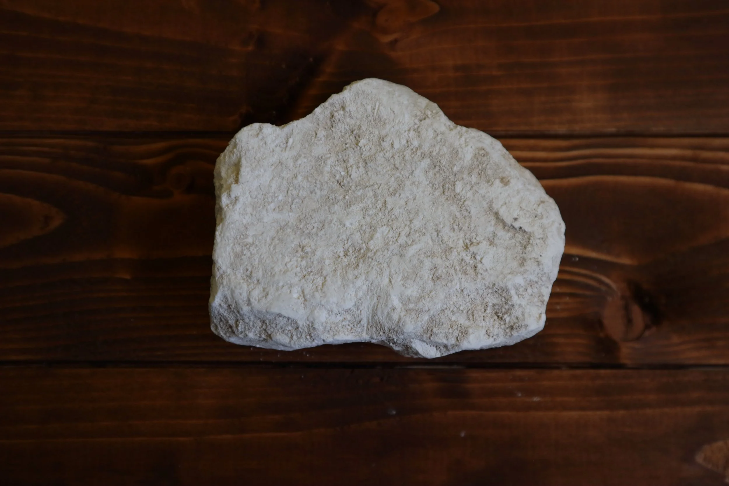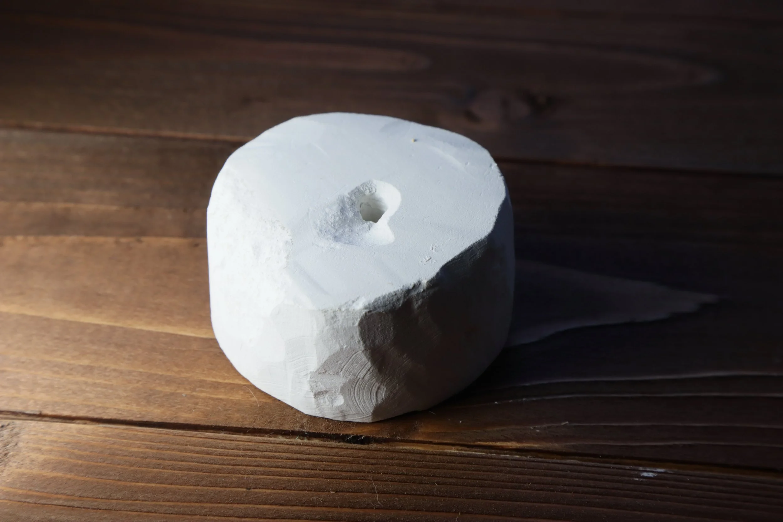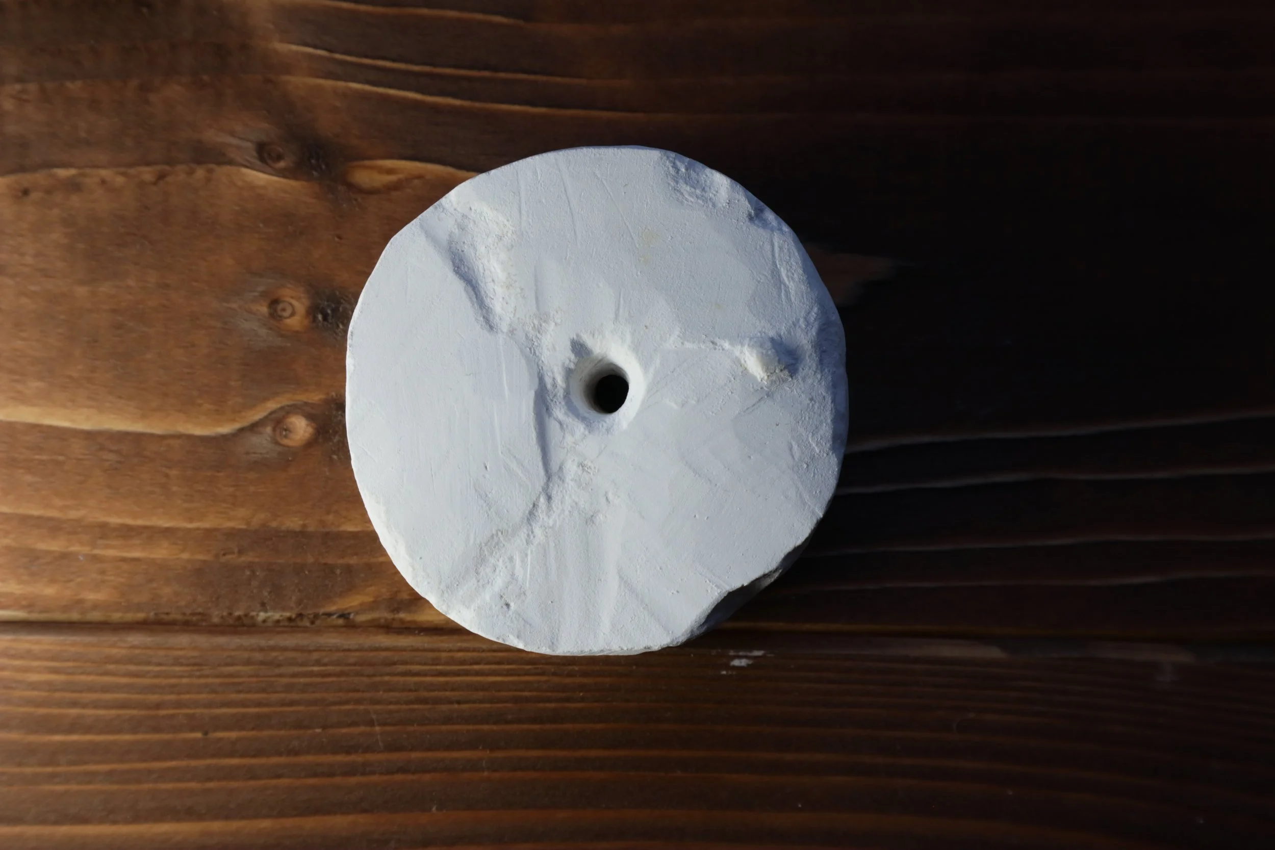 Oblique angle of hand carved chalk whorl, informed via the archaeological assemblage at Danebury hillfort.